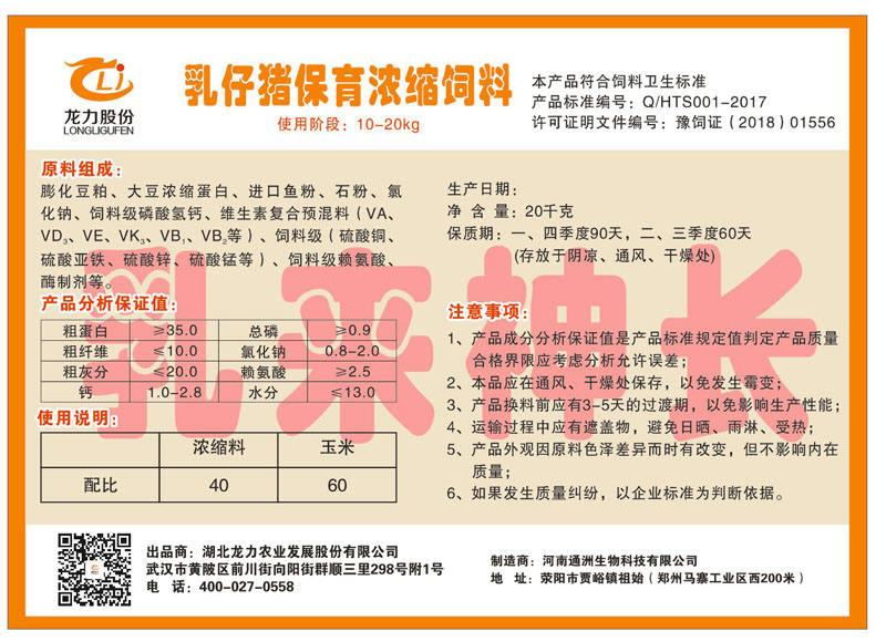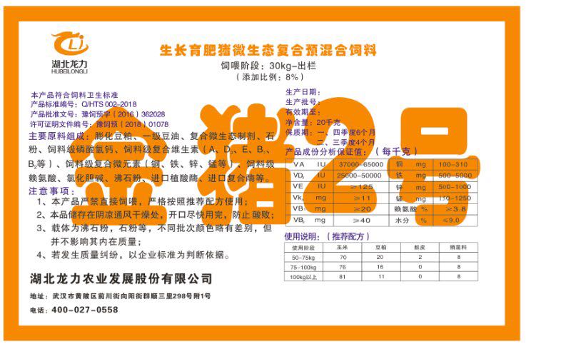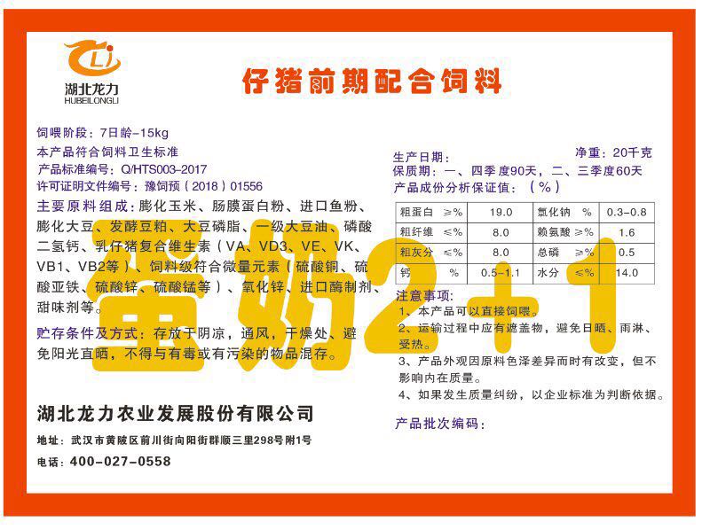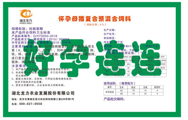 湖北龍力農(nóng)業(yè)發(fā)展股份有限公司坐落于武漢市黃陂區(qū)前川街向陽街群順三里298號附1號。公司成立于2014年6月,公司自成立以來把“創(chuàng)全球最大養(yǎng)豬綜合服務”為企業(yè)愿景。致力于打造教保料品牌”作為公司發(fā)展的明確目標。公司一直致力于豬營養(yǎng)的研究和開發(fā),積極與國內(nèi)外高校和科研機構(gòu)合作,推廣養(yǎng)豬技術、動物營養(yǎng)新概念,向世界農(nóng)牧企業(yè)學習與合作。公司采用國內(nèi)先進的生產(chǎn)工藝,選擇高精度電子配料秤,高均勻度、無殘留混合機等先進設備....